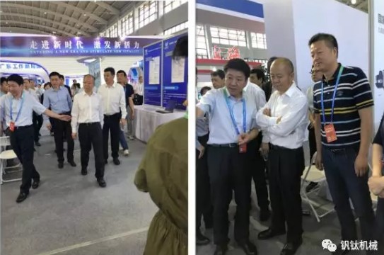 (国家工业和信息化部副部长王江平同志来浙江展团参观)(左一浙江省经信委副主任-岳阳同志,中间国家工业和信息化部副部长-王江平同志,右一杭州钒钛机械有限公司总经理-陈朝锋先生)