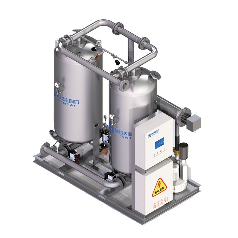 26. 压缩空气由设备入口经阀门控制进入A塔吸附,得到净化的压缩空气,由排气截止阀输出到下游用气点。由鼓风机吸入大气中的空气,加热至合适的温度,进入B塔,对B塔进行再生,解析出B塔吸附剂已吸附的水分。加热完成后,从设备出口引少量成品气对床层进行冷却。FBP型微气耗鼓风热吸附式干燥机结构相对简单、露点温度、气耗低,适用气量范围大,可广泛应用于半导体,化工,锂电,钢铁等露点需求高的行业。